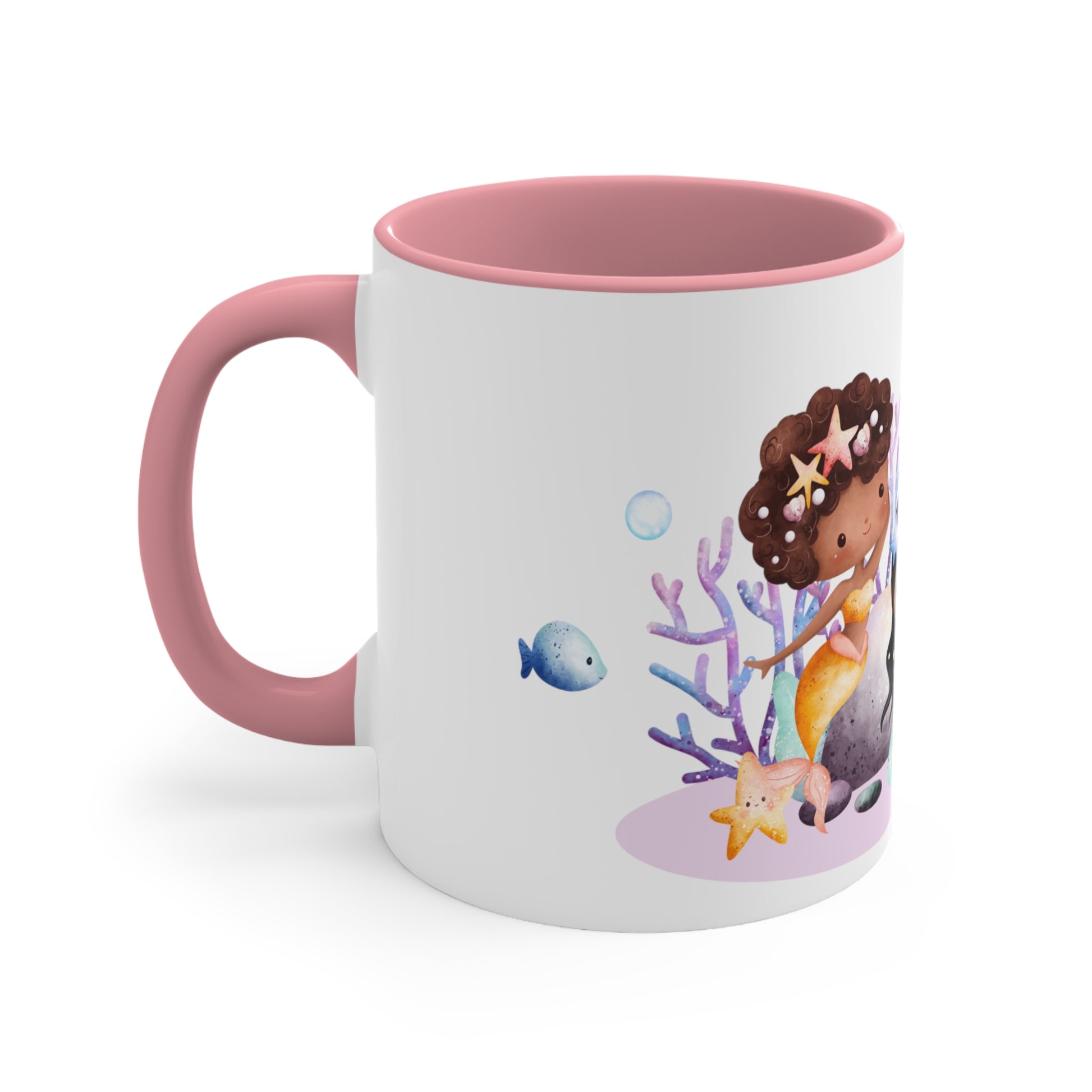 Add some color to your routine with this two-tone, custom accent coffee mug. This 11oz mug features an accented C-Handle that is comfortable to use, as well as an accented interior to add more contrast and character. With your design on this mug, you get an instant winner of a product.